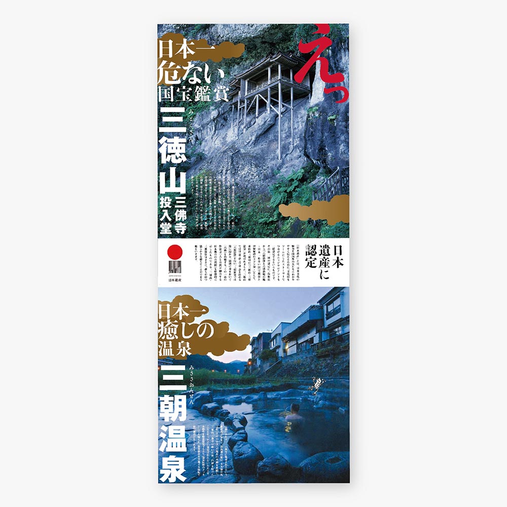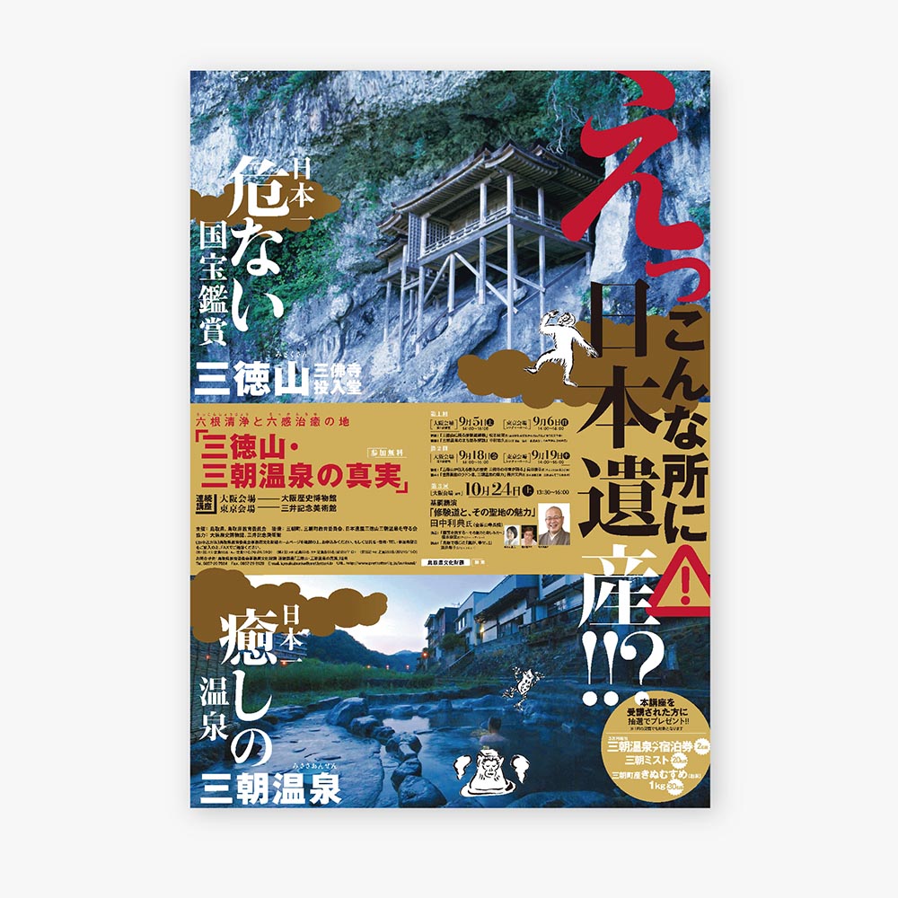 日本遺産に認定された三徳山・三朝温泉の魅力を伝える連続講座のポスター・チラシ。日本一危険な場所にある三徳山三佛寺・国宝投入堂のインパクトを、コピーとビジュアルで表現し興味を喚起。日本遺産の魅力を多角的な視点で考える講座をPRしました。講座の内容をはじめ、トータルに情報発信を担当しました。