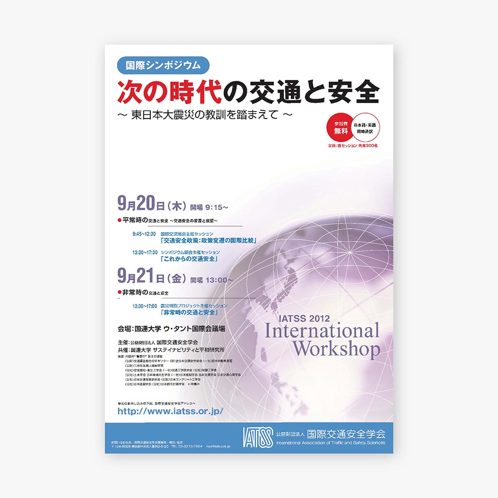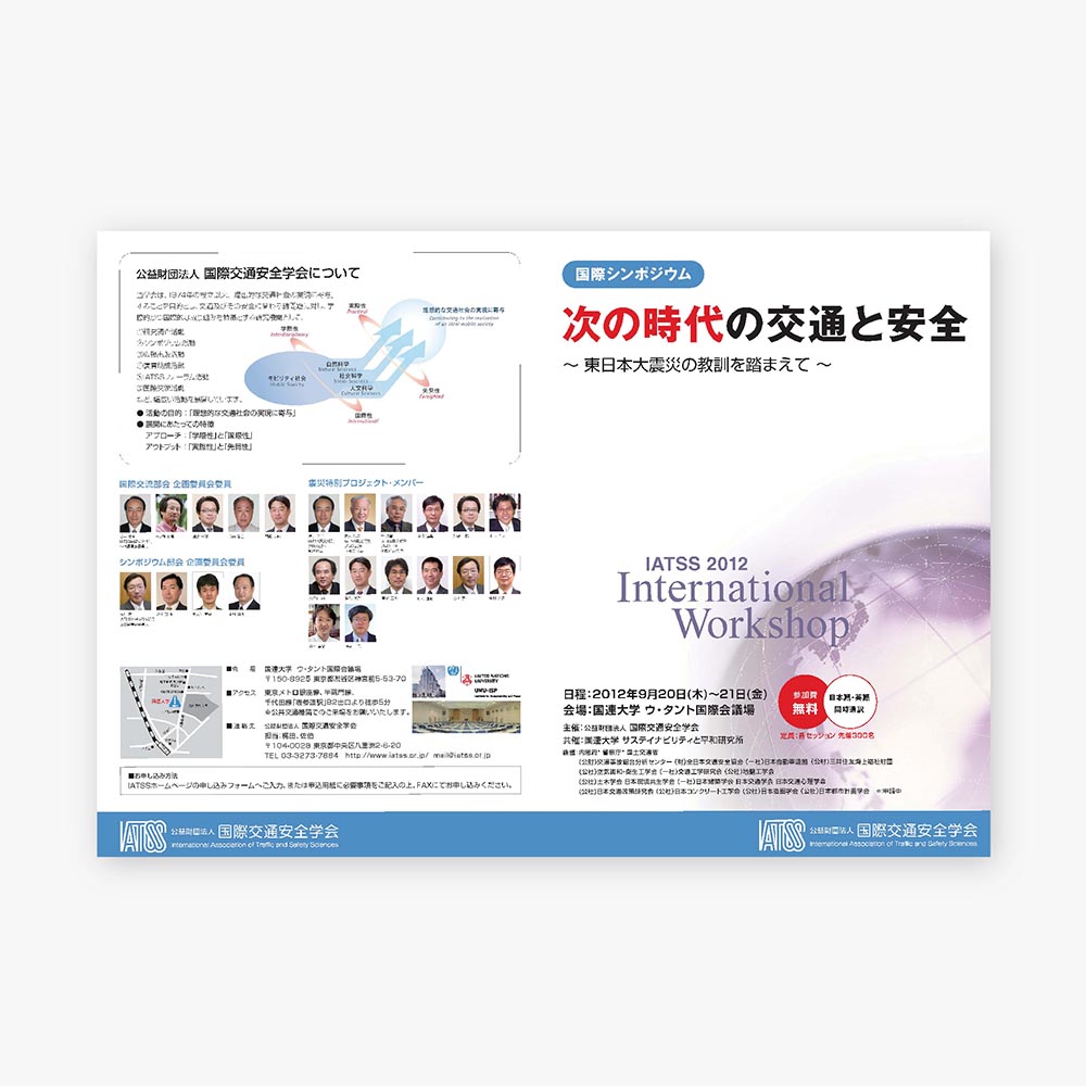 (公財)国際交通安全学会が開催した国際シンポジウム「次の時代の交通と安全〜東日本大震災の教訓を踏まえて〜」のポスター・チラシ。国際的な認知度を高めるためチラシは英語版も作成。パンフレット、当日配布資料、講演者インタビュー映像を制作し、総合的にシンポジウムの情報発信をプロデュースしました。