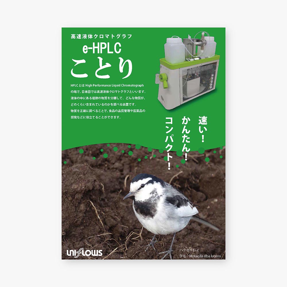 株式会社ユニフローズが開発した分析装置「e-HPLC ことり」の宣伝用チラシ。学生の教育用と業者用の2種類のチラシを制作しました。教育用は、写真とイラストを使い、操作の流れをわかりやすく、コンパクトに紹介。業者用は、装置のポイント、分析事例、仕様を掲載して、装置の導入を検討できるように構成しました。
